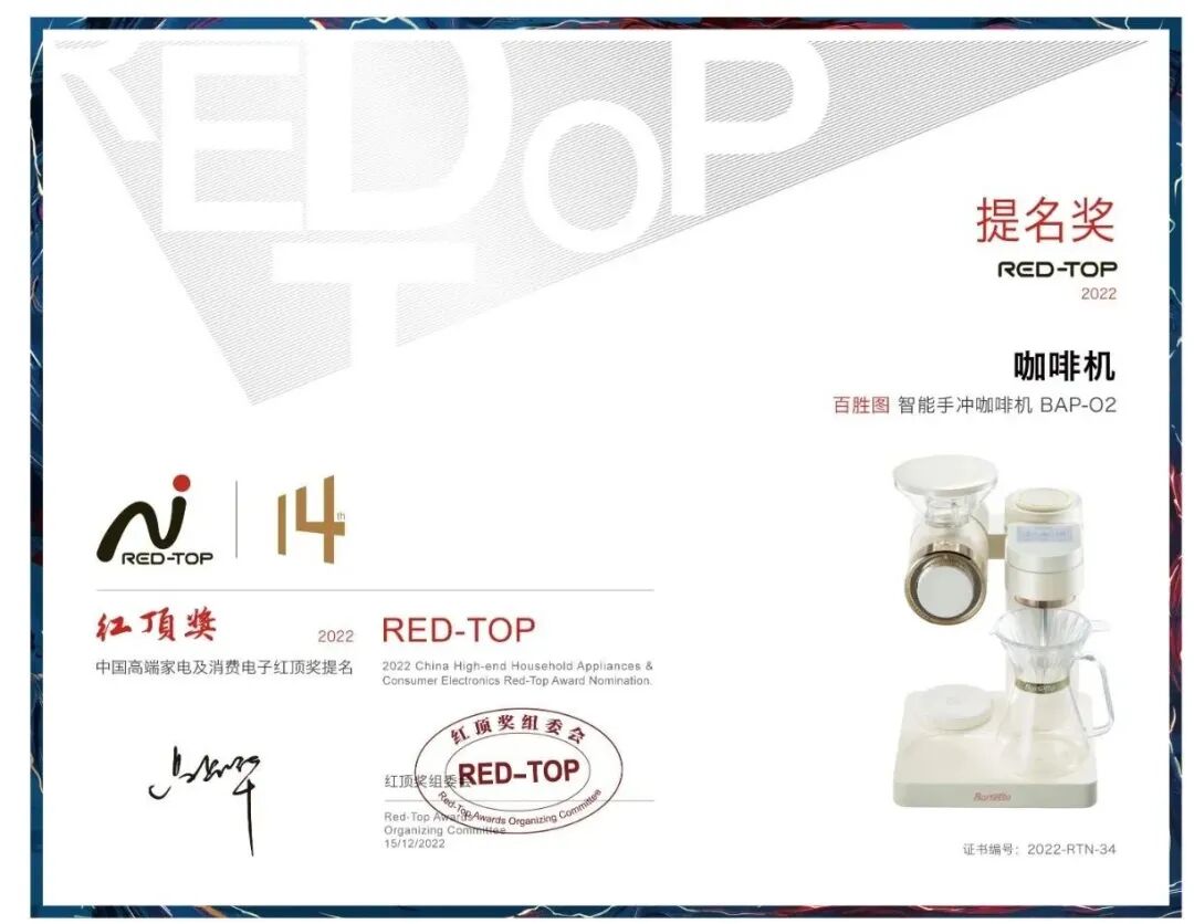 12月15日,由中国家用电器协会指导、红顶奖组委会主办的“第14届中国高端家电趋势发布暨红顶奖颁奖盛典”在北京举行,百胜图智能手冲咖啡机BAP-O2凭着出色的产品实力收获专家与用户的认可,成功提名红顶奖。这是百胜图O2继红点奖与广交会设计创新金奖后的又一个荣誉奖项。