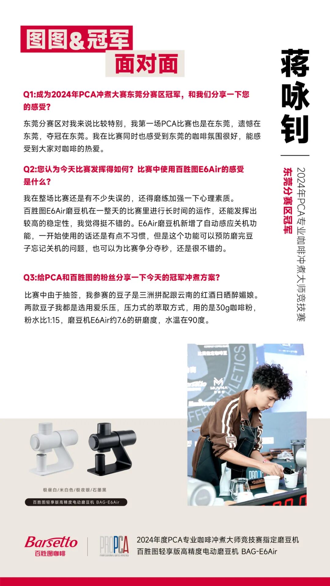 比赛结束后,我们第一时间采访到了PCA专业咖啡冲煮大师竞技赛东莞分赛区的冠军选手,跟他们聊了聊赛场经验与收获,接下来让我们听听他们的分享吧!